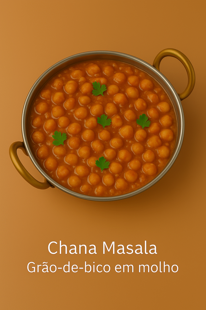 Grão-de-bico cozido lentamente num molho espesso e aromático de tomate, cebola e especiarias indianas. Um prato vegetariano clássico, nutritivo e cheio de sabor.