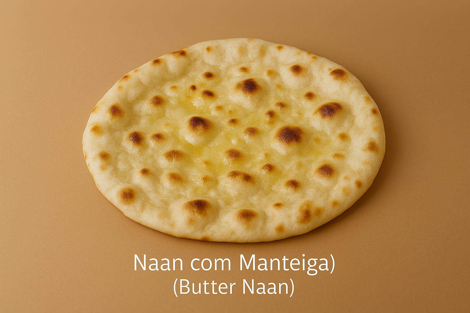 Pão naan tradicional pincelado com manteiga derretida, macio e saboroso. Acompanhamento perfeito para caris e pratos indianos.
