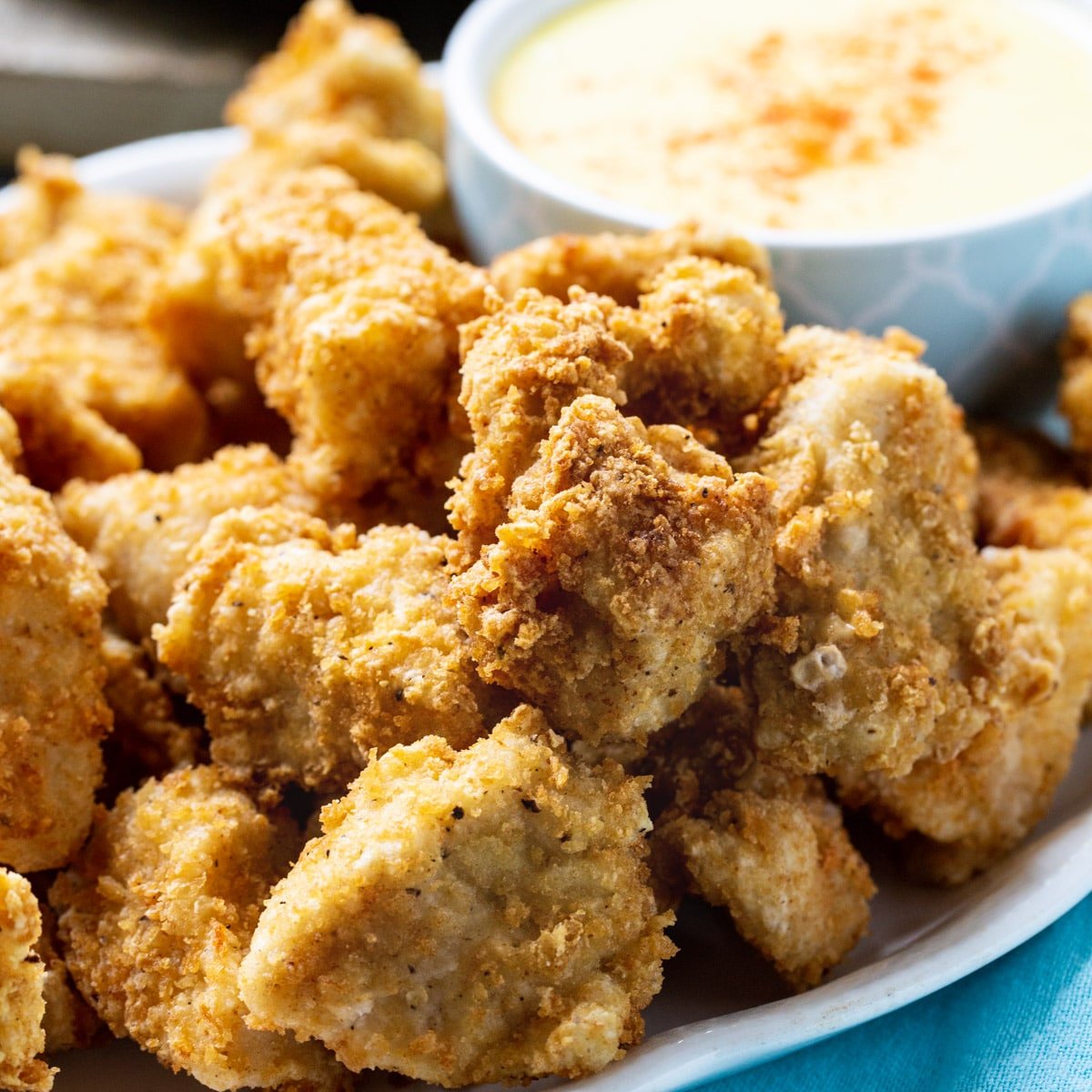 Deliciosos pedaços de frango empanados e fritos até ficarem dourados e crocantes. Perfeitos para petiscar ou acompanhar as suas refeições favoritas.