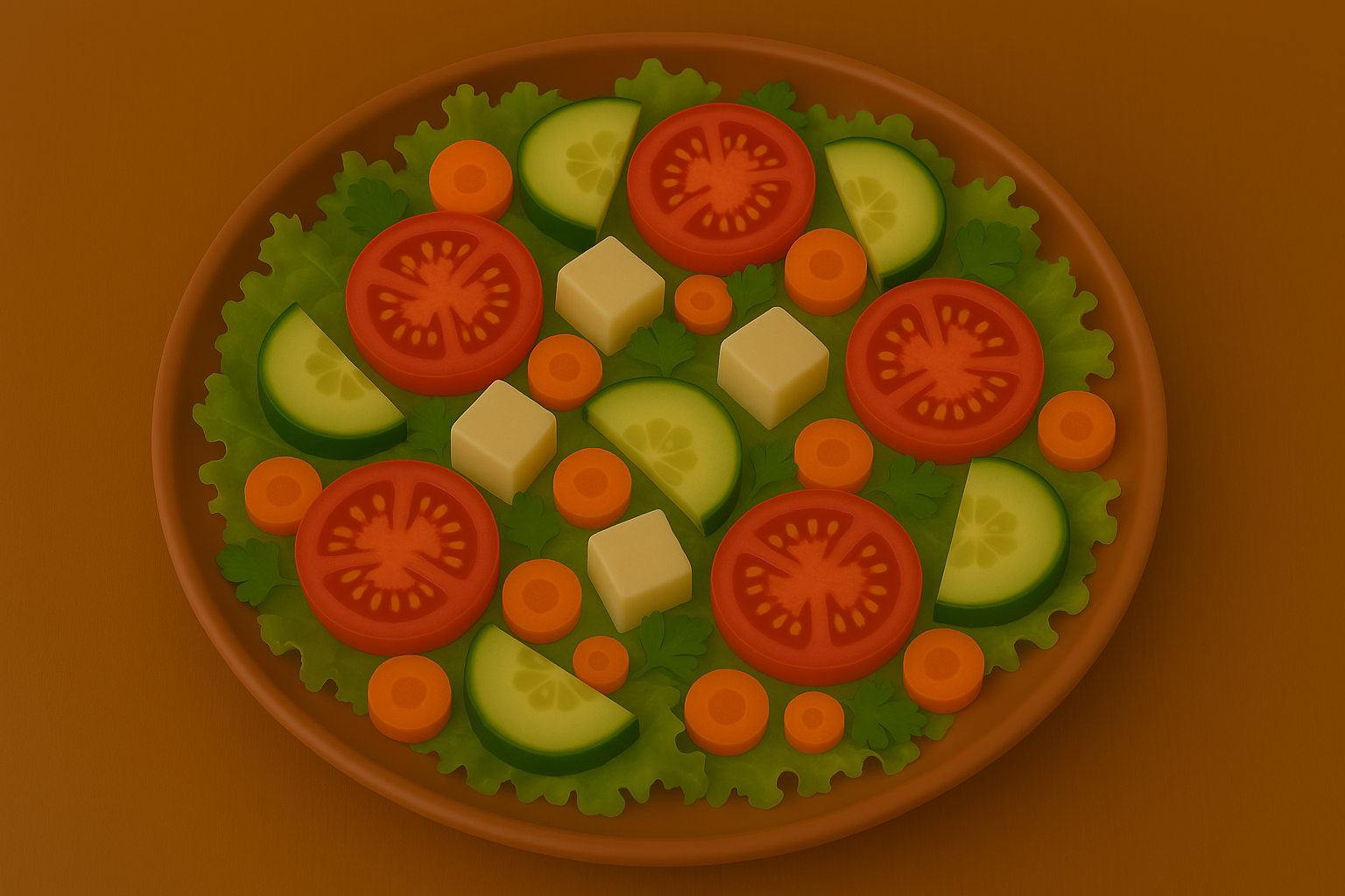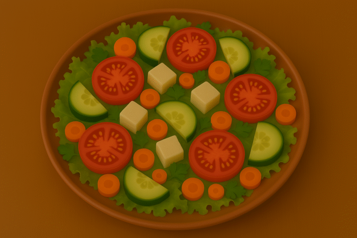 Uma combinação fresca e colorida de alface, tomate, cenoura, milho, cebola e outros ingredientes especiais da casa. Leve, nutritiva e perfeita como prato principal ou acompanhamento.