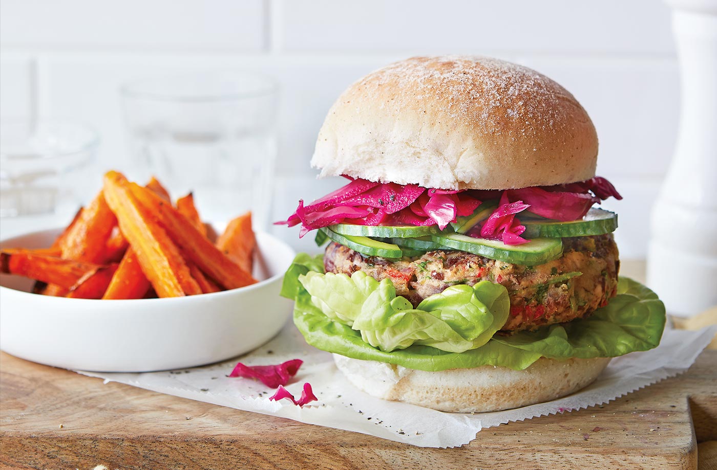 Um hambúrguer 100% vegetariano, servido com batatas fritas crocantes e uma bebida à sua escolha. Uma refeição saborosa e equilibrada para todos os gostos.
